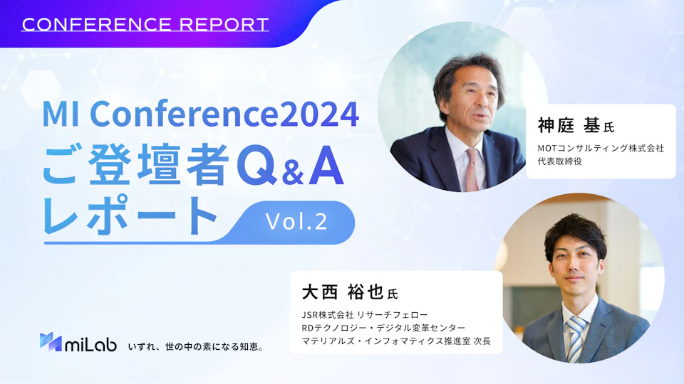 本記事では、「MI普及をきっかけに科学的考察を深化させる」をテーマにご講演いただいたMOTコンサルティング株式会社 代表取締役神庭氏と、「MI推進のアンチパターンとその回避方法」をテーマにご講演いただいたJSR株式会社 リサーチフェローの大西氏の質疑応答のご紹介をいたします。
